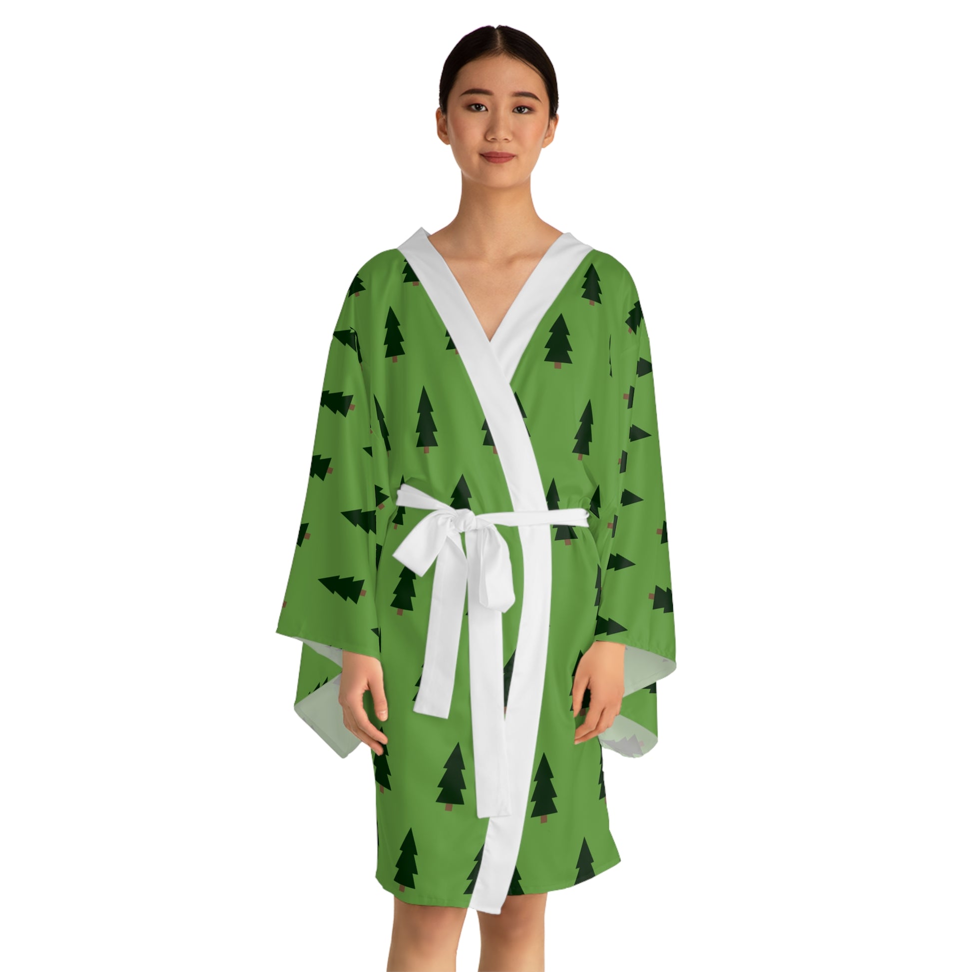 Evergreen Dreams Christmas Robe – Green Holiday Robe with Black Christmas Tree Print by Hula Girls Hideaway